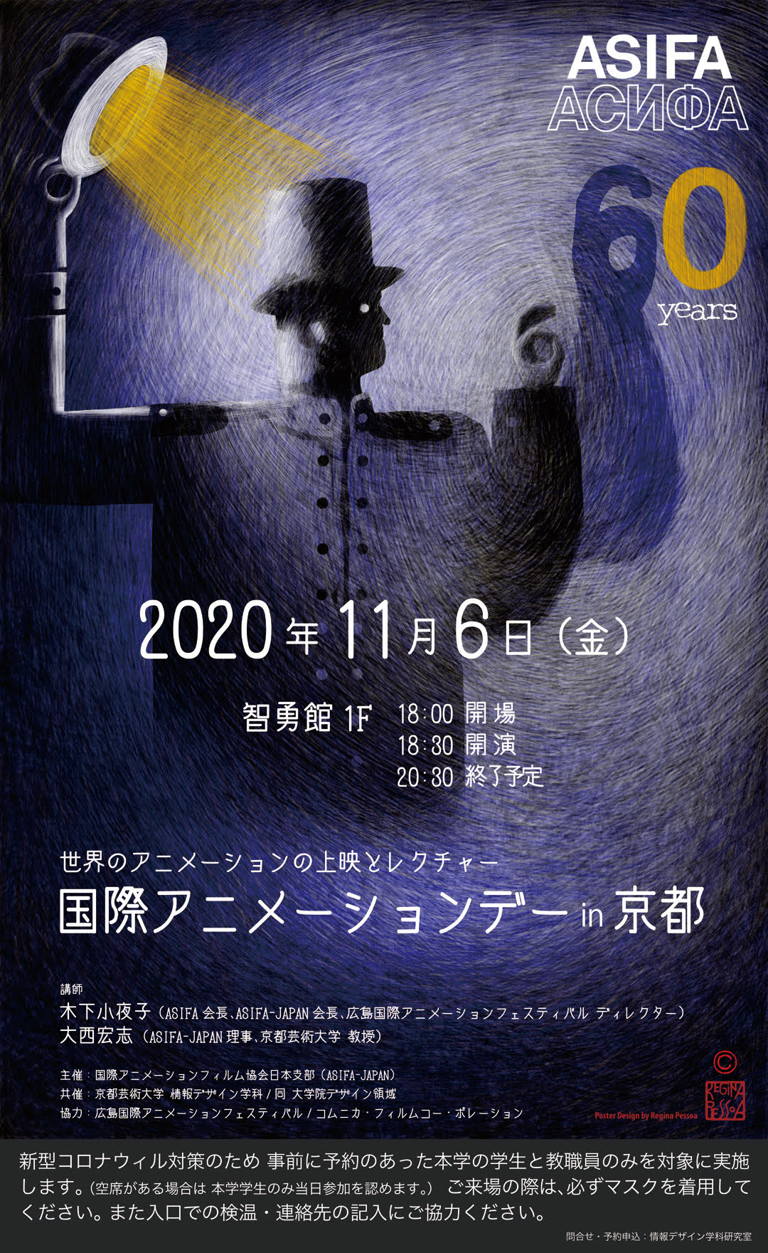 International Animation Day 2020 in KYOTO will be held at Kyoto University of the Arts, on Friday, November 6th, at 18:00 -, as a special class only for students and faculty members to prevent corona virus.
