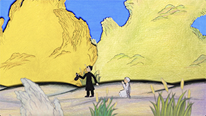 『陰陽』4分45秒 2023年『陰陽』は中国の陰陽の概念に基づいたイランの昔話であり、白(陽)と黒(陰)の二 人のキャラクターが一緒に旅をするという話である。彼らが砂漠に到着したとこ ろ、水がなくなった白は、友人の黒に水を求める。しかし、黒は水を渡すことを 拒否し、二人の間に緊張が生まれる。 |